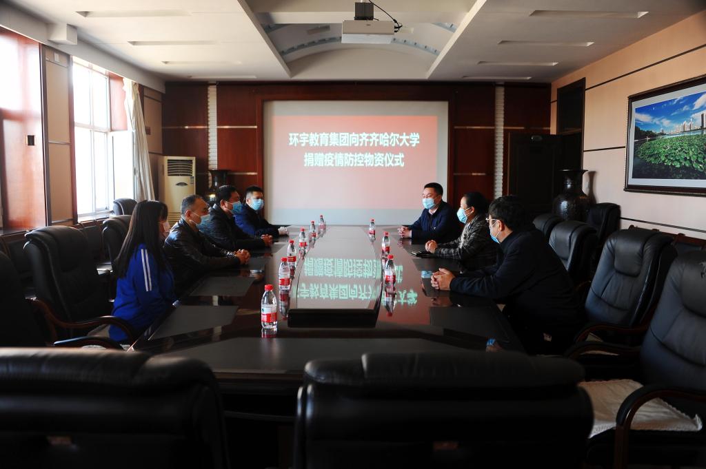 3月23日下午,团市委书记马福明、副书记徐渤程,环宇教育集团齐齐哈尔分校校长孙兴隆等一行8人来到我校,向学校捐赠了八四消毒液100桶、酵素消毒液6桶、酒精2箱、抗疫消毒袋10个和医用口罩500只等防疫物资。学校在办公楼504会议室举行捐赠仪式,校党委书记、校长陈桂芝,校党委副书记张文治出席仪式,校团委负责人参加了捐赠仪式,仪式由陈桂芝主持。