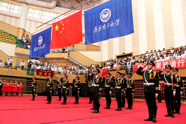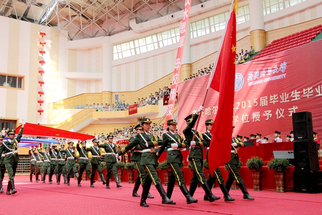 齐齐哈尔大学2015届毕业生毕业典礼暨学位授予仪式举行了隆重的升旗仪式。学校国旗班同学戎装出旗,步履铿锵。