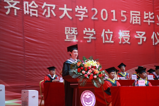 马立群校长为2015届毕业生送上期盼和嘱托,希望同学们继续秉承和发扬“养正毓德精存自生”的校训精神,做一个重德行、勇担当、有创造的齐大人,把优良品德和坚强意志的追求贯穿人生始终,承担起责任,履行好义务。“顺境逆境看胸襟,大事难事看担当”,担当是一种崇高精神境界,一种催人奋进的力量,一种不辱使命的气概,也是齐大人的高贵品质,优秀校友胡萍就是大家的榜样。在我校63年的办学实践中,一届又一届优秀的毕业生走出了校园,他们心怀祖国、志在四方,在各自的领域中通过自己的奋斗谱写出精彩的人生华章。我相信你们一定大有作为!希望你们胸怀远大理想,志存高远,俯身实干,紧跟时代潮流,把握创新发展趋势,抓住宝贵机遇,勇做大众创业、万众创新的践行者,在实现个人梦想和人生价值的过程中,开创出属于你们的美好未来,为实现中华民族伟大复兴做出应有的贡献。