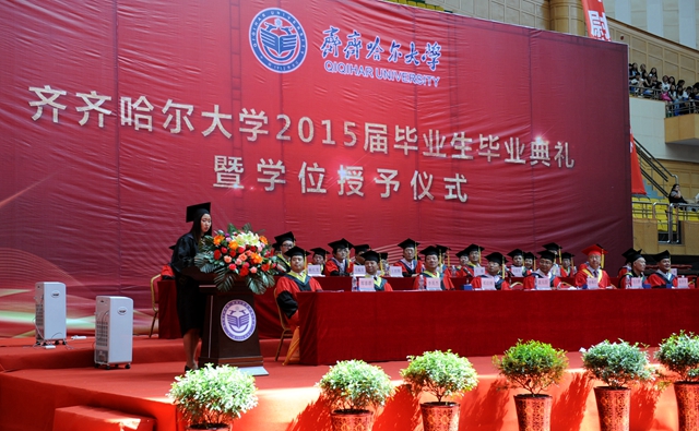 “齐齐哈尔大学2015届毕业生毕业典礼暨学位授予仪式”由校党委常委、常务副校长郑喜群主持