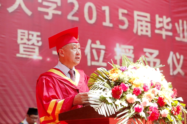 齐平至正,大道中行,腾蛟起凤,飞举远征。从青涩懵懂的少年到睿智成熟的青年, 2015届毕业生一路走来,用勤奋、拼搏和执着演绎着人生的精彩、书写着青春的传奇。今天的毕业典礼后,他们带着母校全体师生的深深祝福扬帆远航,开启人生新的征程。学校希望2015届毕业生牢记学校领导、老师的殷切嘱托,秉承母校“养正毓德、精存自生”的校训精神,见贤思齐,筑梦人生,努力成为有益于祖国、有益于人民、有益于民族、有益于母校的高素质人才。母校将与全体校友携手,凝神聚力,共谋发展,奋力建成有特色高水平教学研究型综合大学,为实现中华民族伟大复兴的“中国梦”贡献力量。