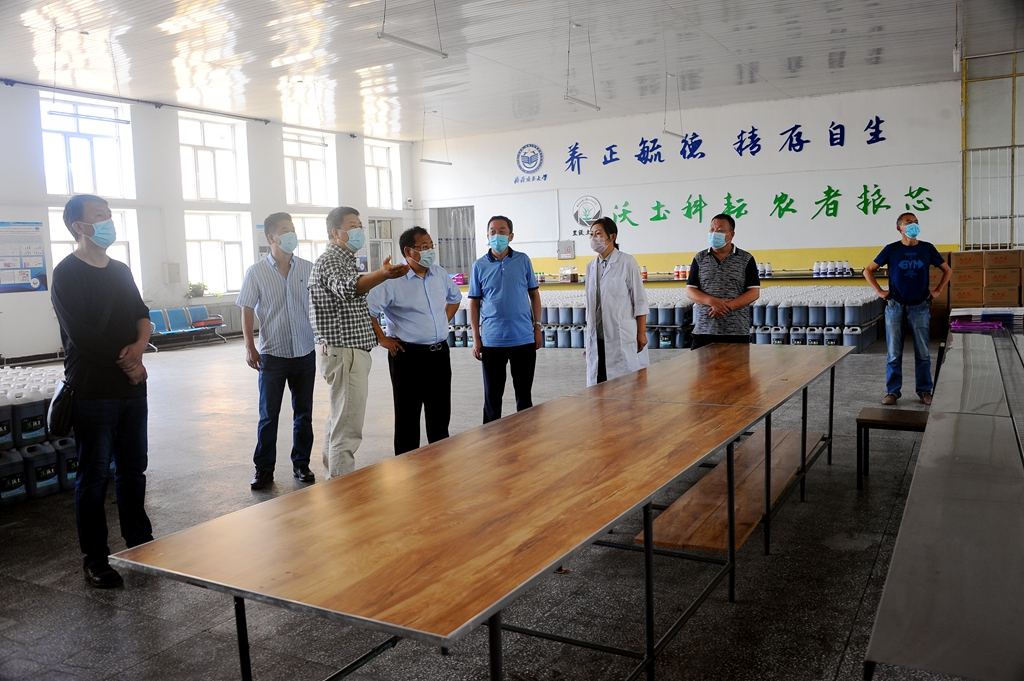 在我校省级农业微生物制剂产业化技术创新中心,董玉庭一行先后察看了中心中试车间生产线、办公场所以及秸秆腐质化还田技术转化的相关成果,听取了青年龙江学者、我校生命科学与农林学院副院长王志刚和与我校共建研发中心的黑龙江省黑沃土生物科技有限公司负责人关于中心运行情况和成果转化、产品市场前景的介绍。