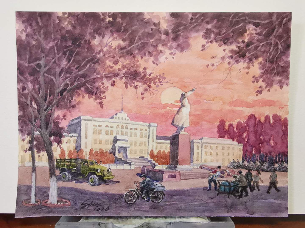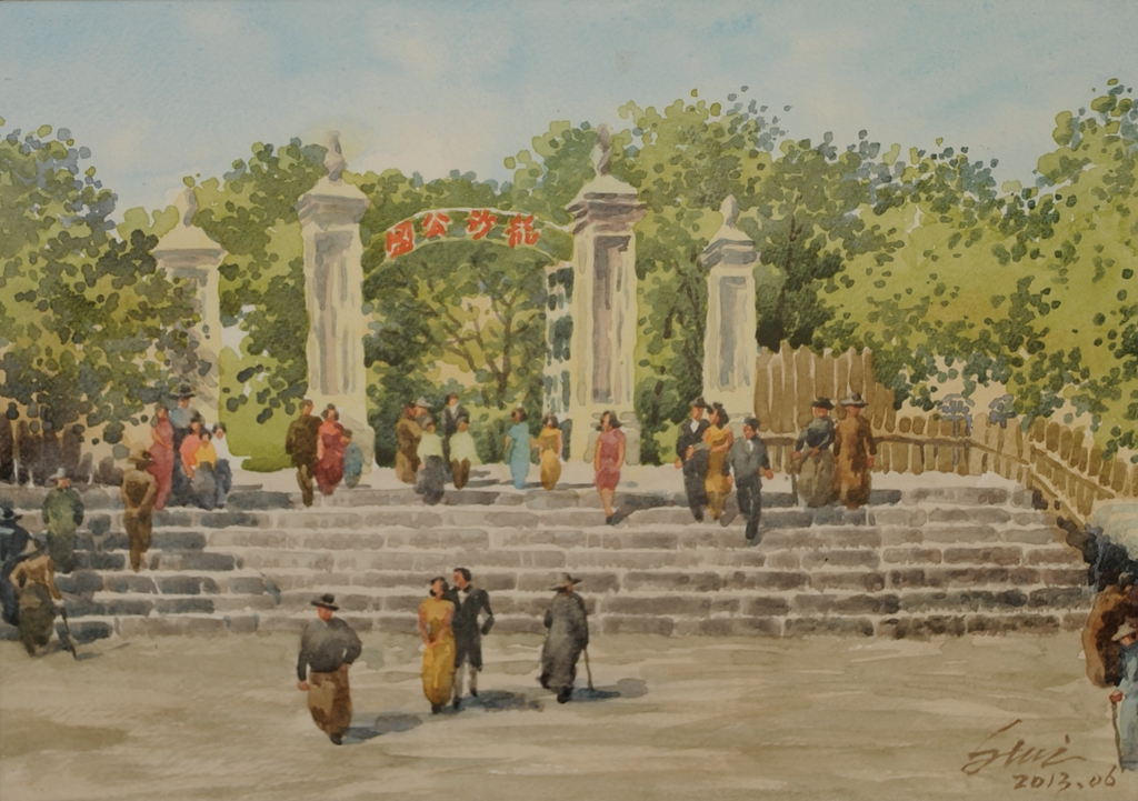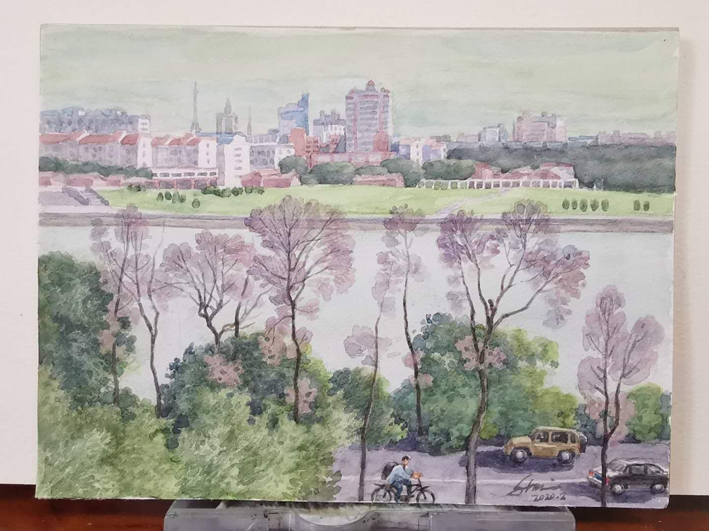 做为本土画家的马振庆教授,对齐齐哈尔市有着深厚的感情。他了解这座城市的历史,切身感受着这座城市的发展,立足这片沃土,把对城市的热爱与心中的情感付诸于笔端,挥笔泼彩。他以娴熟的水彩画技艺,创作了一批展现齐齐哈尔一九四九年前、一九四九年后和改革开放以来的三段历史时期城市面貌变迁的画作。在他的作品中,有的是借用城市老照片进行再创作,有的是自己进行采风的切身感受。在保存城市历史原貌的基础上,融入个人的情思,运用色彩“言物、言情、言意”等多重艺术语言,发挥水彩画的水韵特色,艺术性地表达了齐齐哈尔这座城市的历史变迁和发展变化。他的水彩画,既写实又颇具意象,写实不离法国印象派的色彩美,意象融入中国传统艺术“似与不似”之意境,这是他撷取自然到艺术创作的“移情”,是采自内心的“抒发胸中逸气”,给人以诗意般画境。