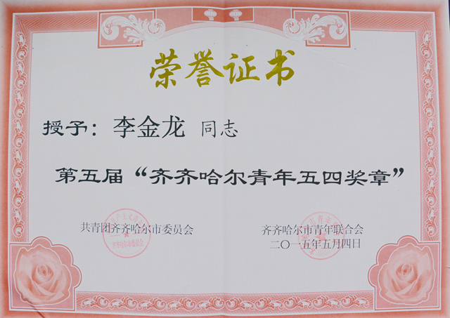5月4日,第五届“齐齐哈尔青年五四奖章”评选结果揭晓,有10名同志荣获第五届“齐齐哈尔青年五四奖章”并受到团市委、市青联的命名表彰。齐齐哈尔大学化学与化学工程学院副院长李金龙博士荣获本届“齐齐哈尔青年五四奖章”,受到命名表彰。市领导季星星、马志军、刘艳芳和团市委领导周长友、郑德利、张利军、孙玲玲等为获奖者颁奖与受到命名表彰的第五届“齐齐哈尔青年五四奖章”获得者合影留念。