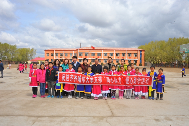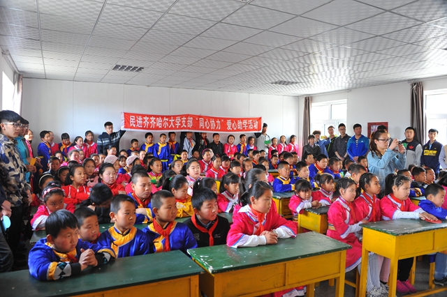 5月6日,在中国共产主义青年团建团94周年、“五四”运动96周年之际,“鸿雁工程”以十八年的厚重积淀迎来了又一年的春暖花开。齐大师生一行三十余人赴梅里斯区哈拉达族小学开展了“大手牵小手·共圆‘中国梦’”同心协力捐资助学活动。齐齐哈尔大学宣传部、统战部部长王晓梅,中国民主促进会齐齐哈尔市委副秘书长秉德新,食品学院党委书记杨淳,哲法学院副院长、齐齐哈尔大学民进支部主委苗绘,食品学院院长裴世春,党委宣传部副部长何强,学生工作部(处)副处长张树启,食品学院副书记、副院长赵振华,食品学院团委书记李海明及食品学院“鸿雁工程”志愿服务队的同学们加了本次活动。