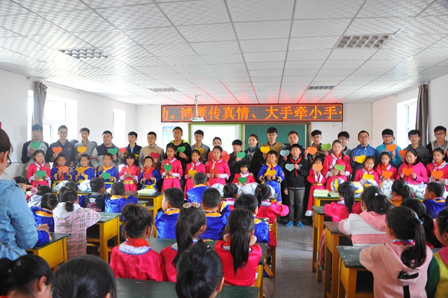 涓涓细流汇成大海,点滴奉献铸就大爱。“鸿雁工程”18年来不间断的付出影响了很多人,佟赟康本是一名哈拉达族小学的学生,在“鸿雁工程”的资助与爱心的影响下,现在也加入到这个队伍中来,为“鸿雁工程”注入了新鲜的血液。通过这次的捐资助学活动,不仅实现了大学生与小手们的零距离接触,更加提高了大学生的责任心,增强了责任意识。鸿雁因爱而生,鸿雁人因爱而美,希望在“鸿雁工程”的带动下,会有更多的人懂得奉献的意义,明白自己的社会责任感和使命感。