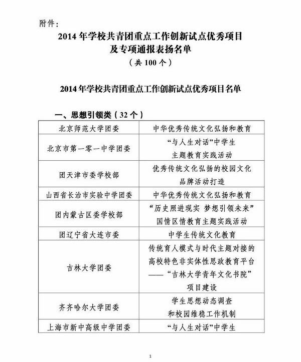 为更好地总结、运用和提炼创新试点工作取得的经验成果,进一步巩固提升学校共青团的基础性战略性源头性地位,团中央学校部决定对2014年学校共青团重点工作创新试点中100个优秀项目进行通报表扬。