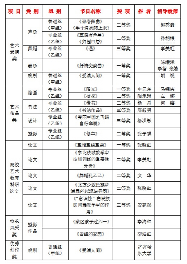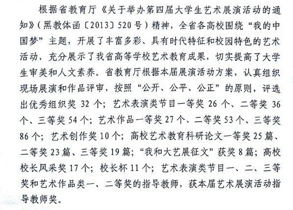 为深入贯彻党的十八大精神,全面落实党的教育方针,围绕立德树人根本任务,促进高校学生德智体美全面发展,展示我省高等学校艺术教育的成果,黑龙江省教育厅特举办了“全省第四届大学生艺术展演活动”。我校师生展演项目喜获佳绩。