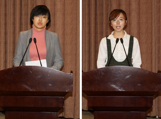 优秀指导教师代表苗凤娟、优秀学生代表孙秀娟分别代表获奖师生发言