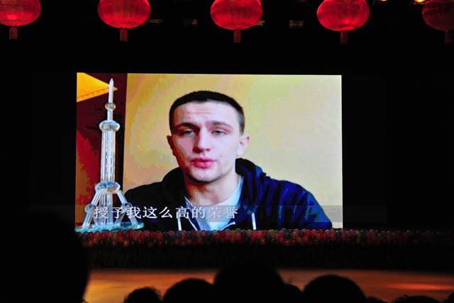 伊戈尔前些天因事去了上海,得知获奖的消息后,他很激动,特意用录了一段视频发给组委会。颁奖仪式上,学校用大屏幕播放了伊戈尔的讲话视频,向学校致谢。