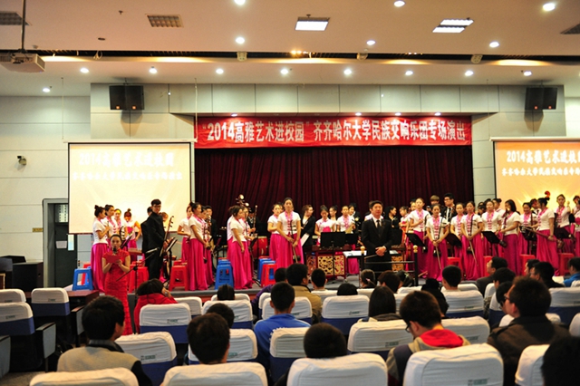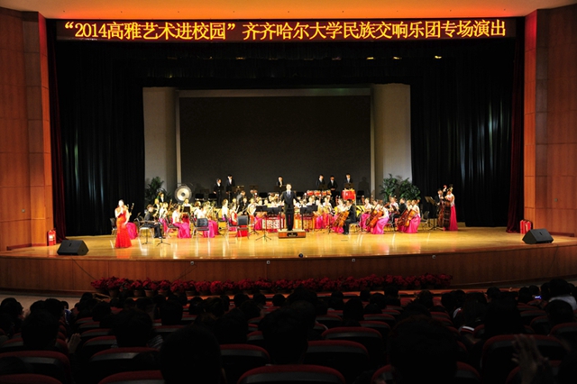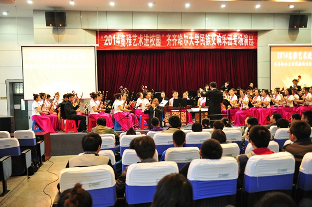 琴瑟传佳音,雅曲奏和谐。齐齐哈尔大学民族交响乐团“高雅艺术进校园”专场演出分别在黑龙江建筑职业技术学院文化艺术中心、哈尔滨理工大学西区一号楼0220报告厅举行。在各高校演出前,我校播放了齐齐哈尔大学视频宣传短片《飞翔齐大》,扩大了学校的影响力和知名度。齐齐哈尔大学民族交响乐团师生用美妙的音乐、感人的歌声,传递着诚挚问候,为哈尔滨五所高校的数千名师生献上了民族音乐艺术的文化盛宴。