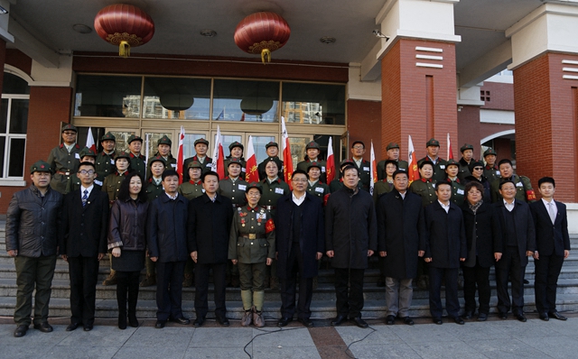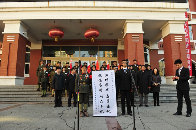 抗联老战士、原黑龙江省政协副主席李敏代表黑龙江省东北抗日联军历史文化研究会向我校青年学生赠送书有“江桥抗战奋勇杀敌 抗倭名将 功在千秋”的书法作品。