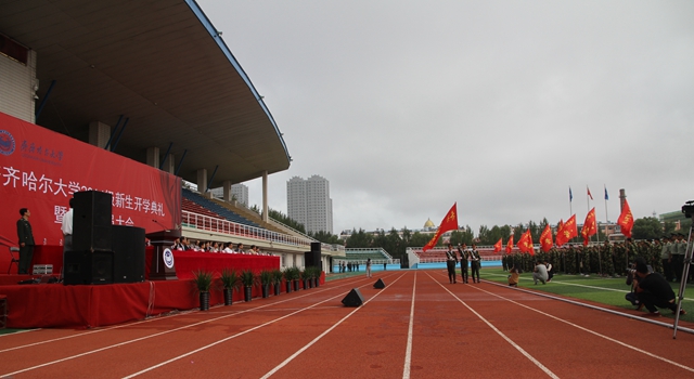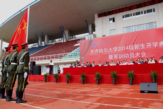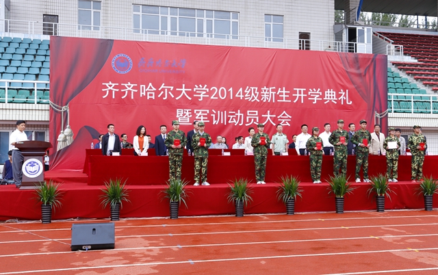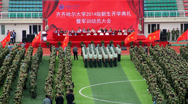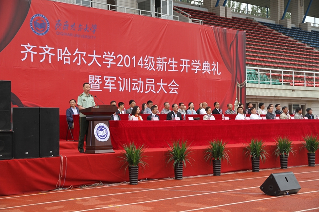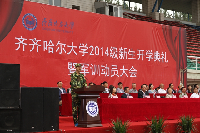 校党委常委、组织部长齐宏伟,校长助理、教务处处长张树军,校长助理、后勤党委书记、处长尹鸥,军训团领导成员、各学院党委书记在大会主席台就座。承担我校此次军训任务的中国人民武装警察部队齐齐哈尔支队74名教官、2014级全体新生按1-20营顺序列队参会。
