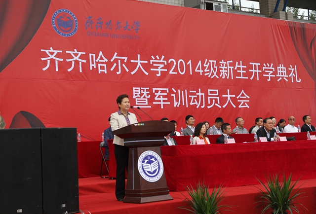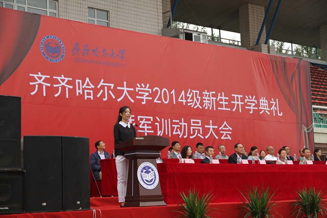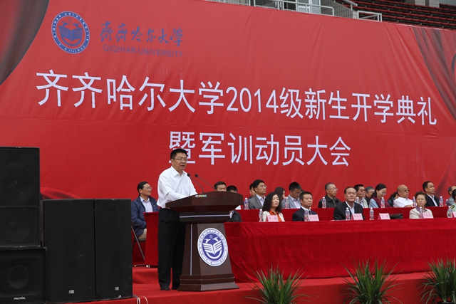 8:30,齐齐哈尔大学2014级新生开学典礼暨军训动员大学开始。会议由常务副校长郑喜群主持。
