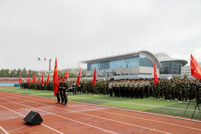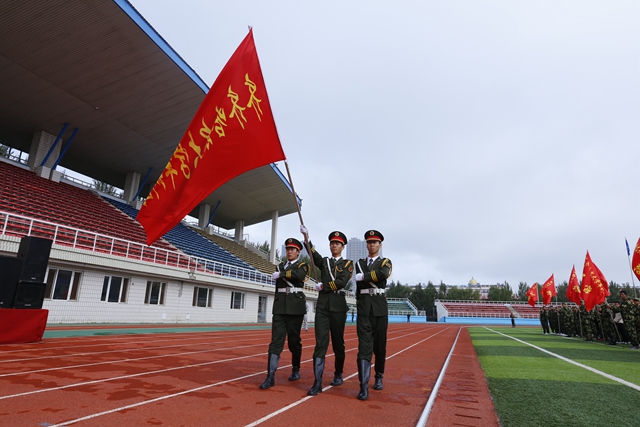 学生代表迎“齐齐哈尔大学军训团团旗”
