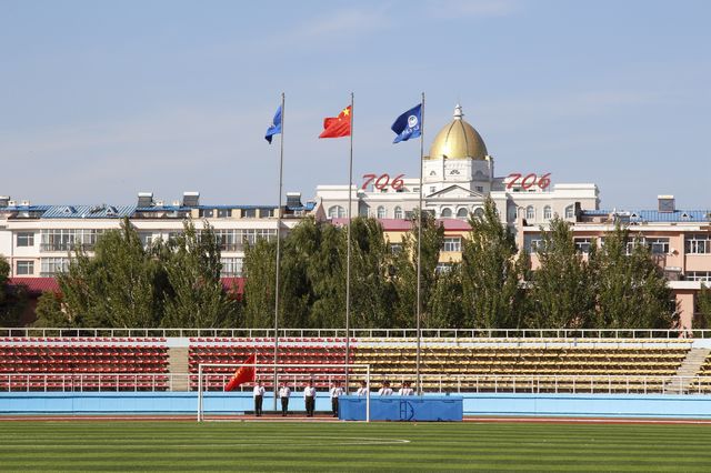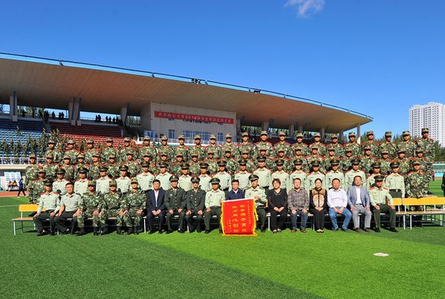齐齐哈尔大学2014级学生军训总结大会闭会后,与会校处领导与武警齐齐哈尔支队官兵合影留念。