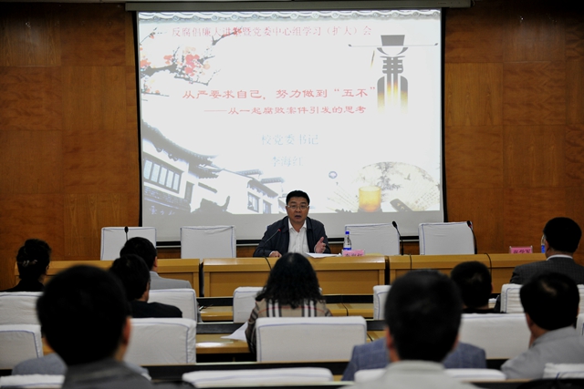 他强调,高校党委是党风廉政建设的责任主体,要自觉担负起全面领导反腐倡廉建设的政治责任。同时,李海红书记代表学校党委对学校党员领导干部加强自身建设、提高拒腐防变能力提出了要求,希望我校党员干部尤其是领导干部要始终做到自重、自省、自警、自励,不断加强思想道德修养,筑牢思想防线,坚守做人为官底线,坚决做到“五个绝不”(不放纵、不放弃、不放任、不放松、不放下)。