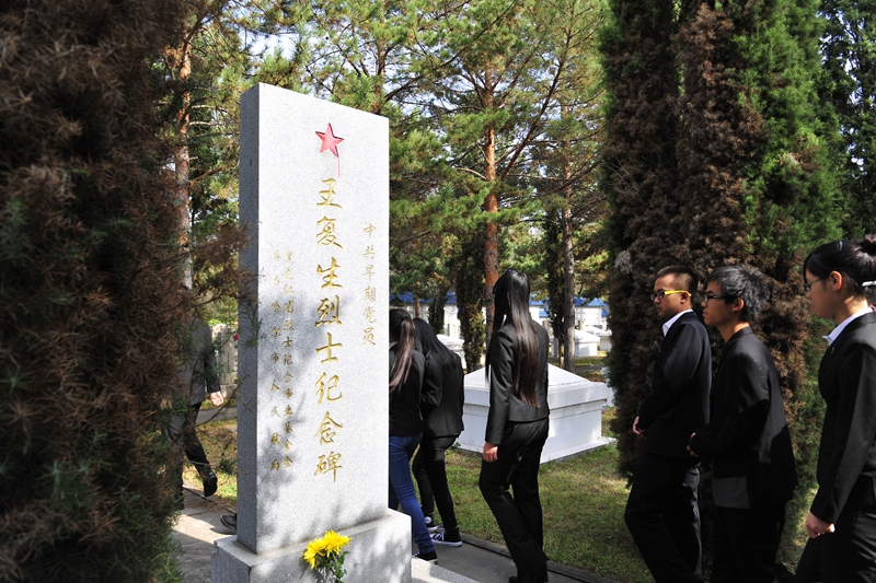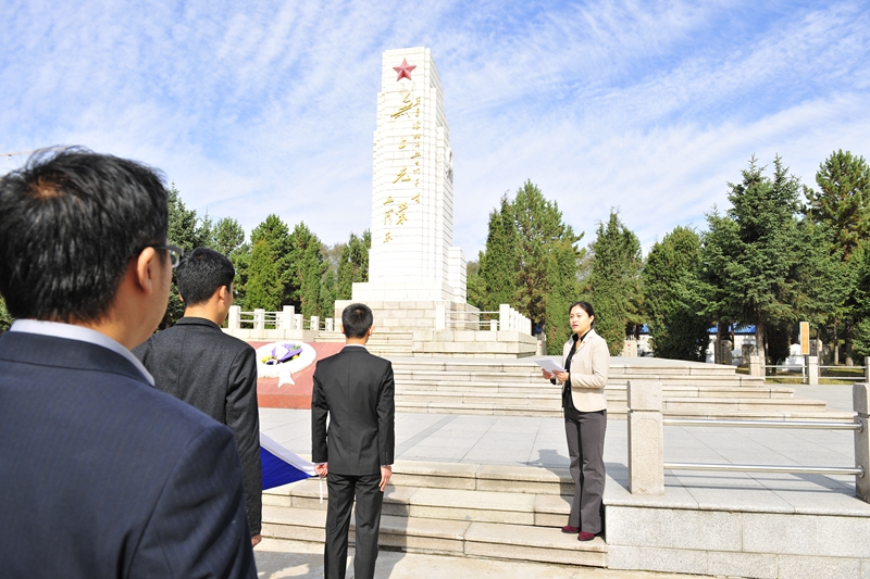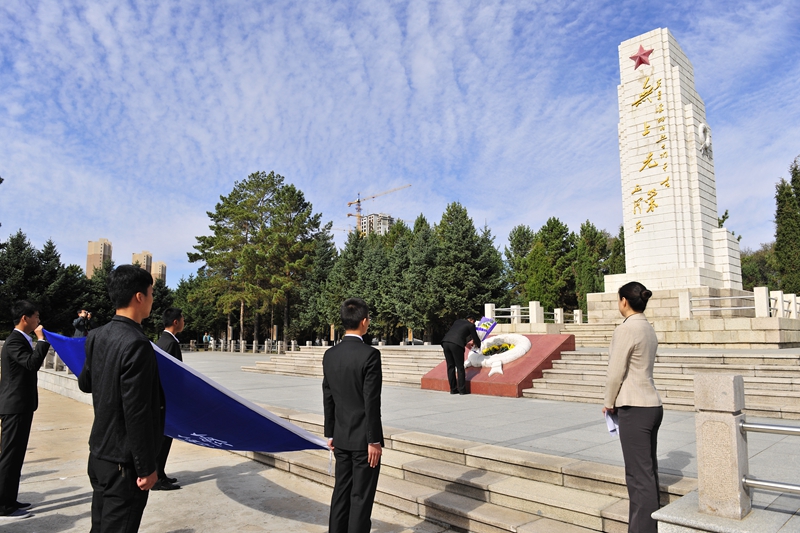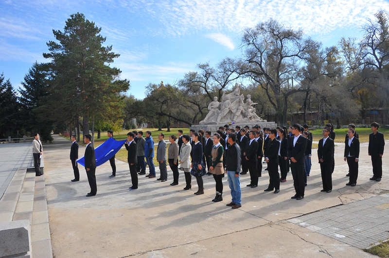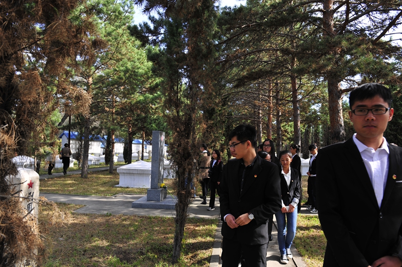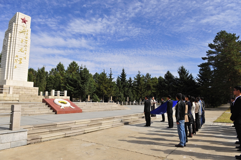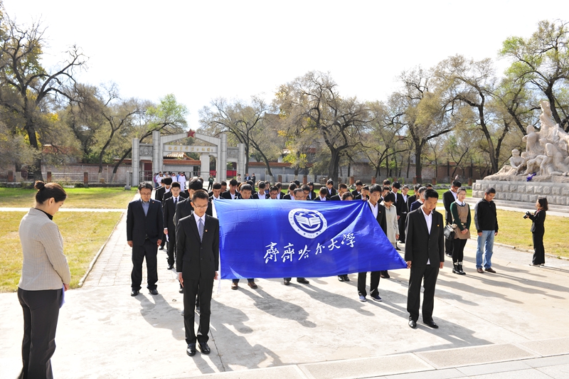 为庆祝建国65周年,缅怀烈士功绩,弘扬烈士精神,践行社会主义核心价值观,在第一个烈士纪念日到来之际,我校机关党委、校团委组织师生代表50人来到西满革命烈士陵园,深切缅怀革命先烈的丰功伟绩,告慰他们的在天之灵。校党委宣传部、统战部副部长孟宪国、文学与历史文化学院副院长肖国栋、校团委副书记迟生茂等与青年教师党员代表、来自各学生组织的青年学生代表参加了本次祭扫、献花活动。校团委副书记苏醒主持了祭扫献花仪式,并宣布:“‘缅怀革命先烈,弘扬中国精神’祭扫暨践行核心价值观第四次集体学习活动正式开始!”