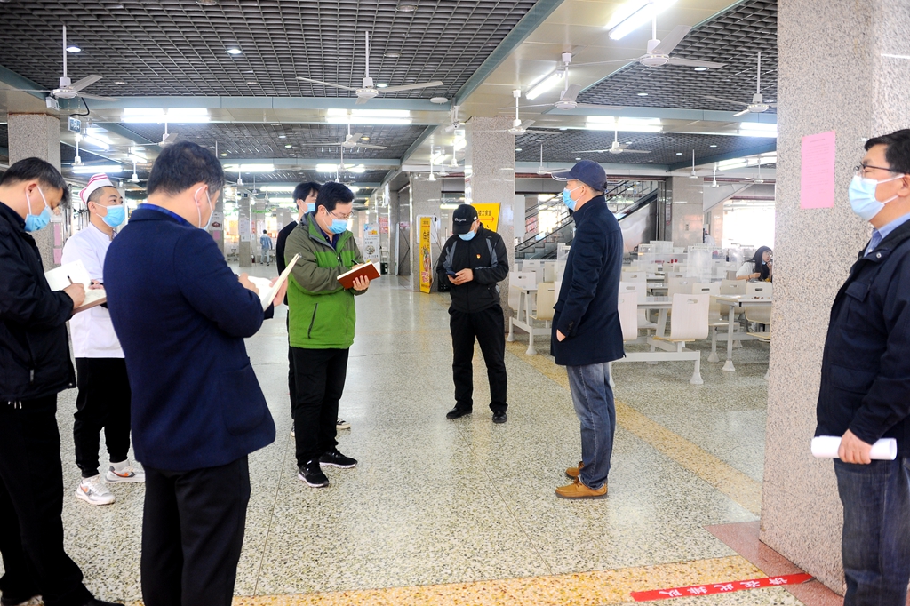 工作组先后来到中区西门、11号教学楼、校卫生所、校内快递投放点、中区购物中心、中区食堂、培训中心临时隔离点等重点部位巡查疫情防控措施是否严实。重点巡查了师生佩戴口罩是否规范、楼宇场馆等公共区域和洗手间消杀是否到位、快递消杀是否规范、师生进入楼宇场馆是否扫码、卫生所接诊流程是否规范、食堂餐桌是否安放隔板、食堂菜价是否合理、学校防疫物资储备是否充足、临时隔离点管理是否规范暖心,询问了相关单位应急演练情况。巡查过程中还听取了相关工作人员对于本单位疫情防控情况的汇报,查看了部分单位防疫消杀记录,并对实地排查中发现的问题提出明确整改要求和整改时限。