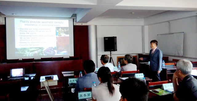 上午9:00,食品与生物工程学院院长裴世春在西主学术报告厅主持学术报告。来自庆尚大学校的鄭秉龍教授首先作了题为“Tissue Culture as an Efficient Tool for Mass Propagation and Research of Ornamental and Medicinal Germplasm”的学术报告。来自韩国庆尚大学校金正煥教授、孔一根教授,吉林农业大学刘景圣教授、闵伟红教授,我校生命科学与农林学院王志刚博士、食品与生物工程学院余世锋博士、宋春丽博士分别作了专题学术报告。