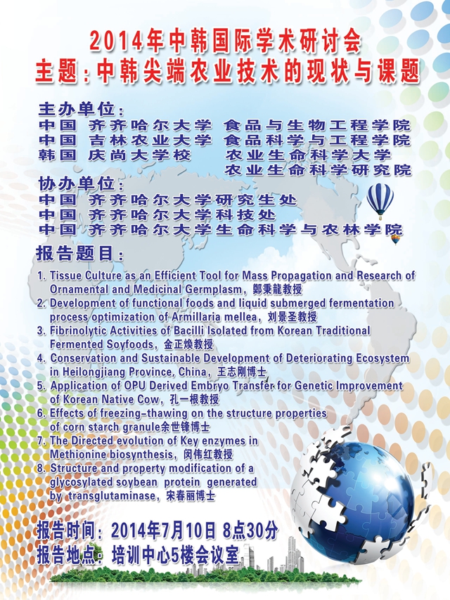 2010年7月,齐齐哈尔大学与韩国国立庆尚大学签署了“合作培养博士研究生协议”,我校派遣2名师生到庆尚大学攻读博士学位,其中1名教师即将学成归国;2012年,我校食品与生物工程学院与庆尚大学农业生命科学学院签署了学术交流合作协议,结成友好学院。本次研讨会的成功召开,为三所高校教师提升科研能力将起到积极的推动作用,为三所高校之间开展学术交流与研讨搭建了平台,也为中韩两国的农业的科学发展注入了活力。
