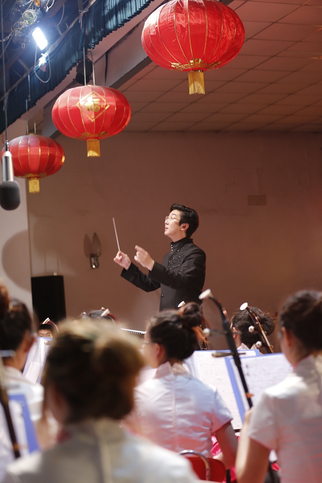 民族交响音乐会由曾留学俄罗斯并获得硕士学位的青年指挥才俊陈曦泽执棒。在开场曲民乐合奏《龙腾虎跃》中启幕。乐曲中的鼓乐在民族乐器的烘托下,显的特别气势磅礴,欢快热烈,洋溢着浓烈的节日气氛和浓郁的民族风格。