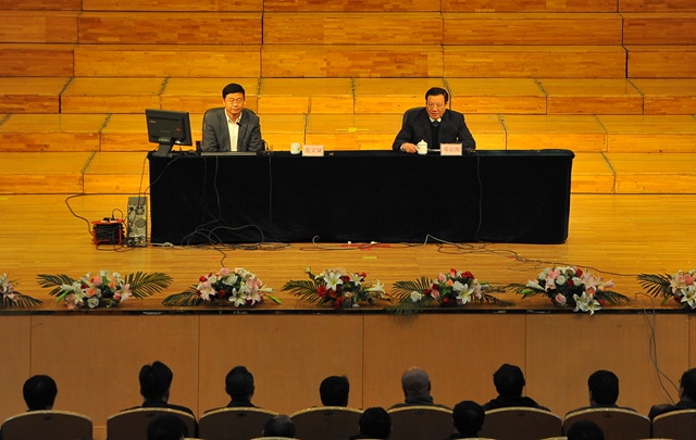 校领导李海红、马立群、郑喜群、邓启刚、李英杰与1200余名教职工一起聆听了专题报告。副校长邓启刚主持了专题报告会。
