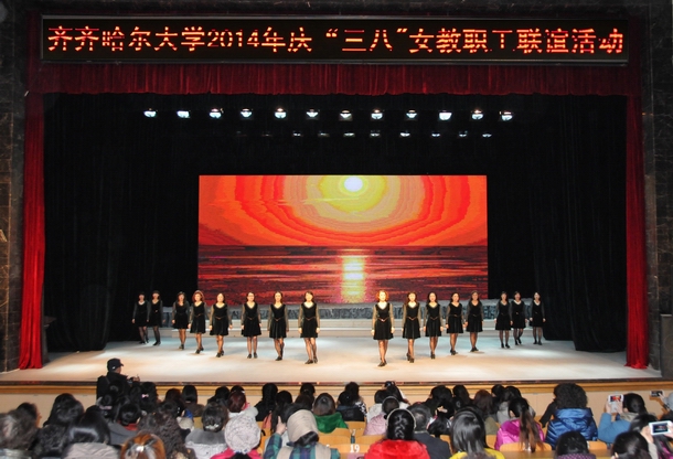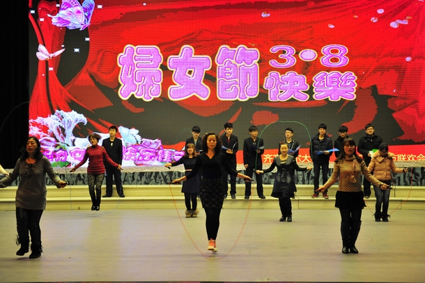 庆祝活动精彩不断,斗智斗勇的扑克比赛,活跃身心、增强体质的跳绳比赛,具有民族特色的谜语长廊使女教工们放松了身心,愉悦了心情,陶冶了情操。妙趣横生的比赛不乏紧张激烈,但更多的是她们开心的笑声和欢乐的喝彩。形式多样,内容丰富的文艺娱乐演出,更是把本次的庆祝活动推向高潮。活泼欢快、情趣盎然的藏族舞蹈,引人捧腹、搞笑幽默的三句半,热情洋溢、重温经典的歌曲联唱,激情四射、活力绽放的踢踏舞不时赢得了观众的阵阵喝彩,演出在音乐与舞蹈学院全体女教师一首气势恢宏的《红色娘子军军歌》中圆满落幕。