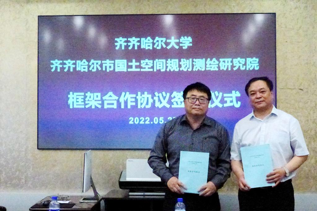 为推动人才培养供需对接,探索协同育人新模式,深化学校与地方科研院所合作交流,5月27日上午,齐齐哈尔大学与市国土空间规划测绘研究院框架合作协议签约座谈会在市国土空间规划测绘研究院会议室举行。副校长王刚、齐齐哈尔市国土空间规划测绘研究院院长刘曦光出席会议,建筑与土木工程学院党委书记滕永富、院长张道明、党委副书记崔继贤、城乡规划系主任毕明岩;齐齐哈尔市国土空间规划测绘研究院副院长王利军、副院长石善福、副院长高晓东等参加会议,会议由刘曦光院长主持。