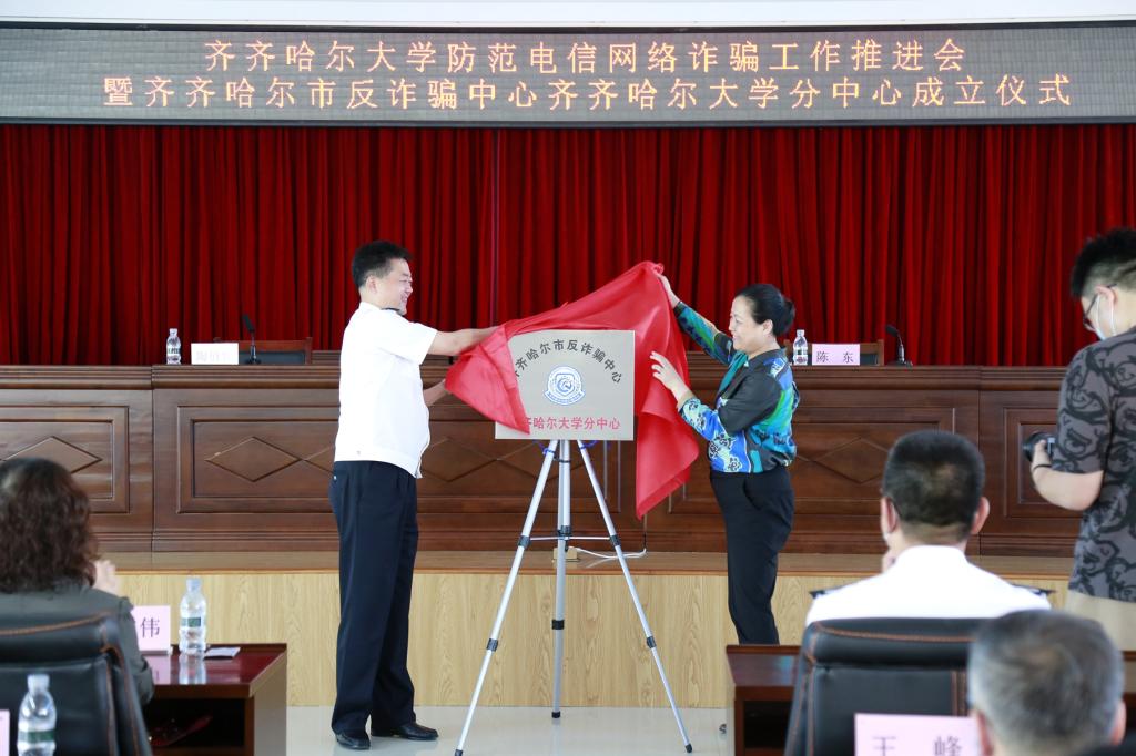 校党委书记陈桂芝与副市长陈东分别代表校地双方在成立仪式上共同为齐齐哈尔市反诈骗中心齐齐哈尔大学分中心揭牌。