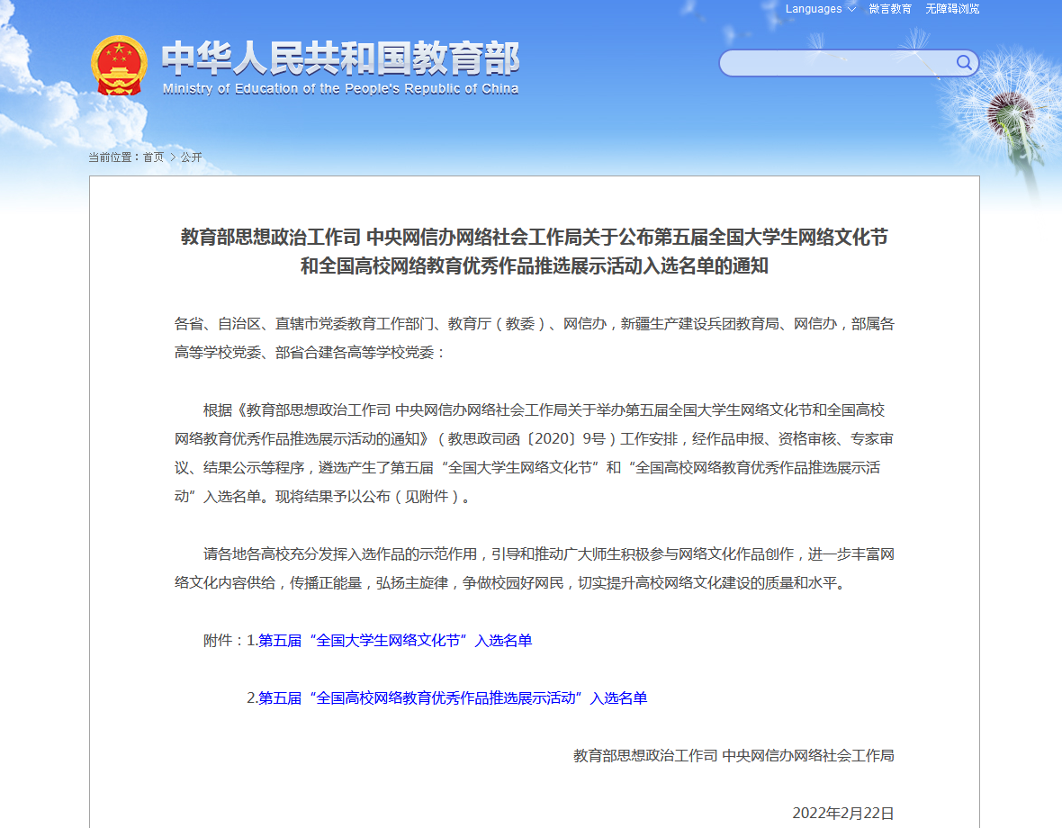 据悉,作为全国高校网络思政领域最高级别竞赛之一,第五届“全国大学生网络文化节”和“全国高校网络教育优秀作品推选展示活动”两项活动共收到作品54822件,覆盖全国31个省(区、市)和新疆生产建设兵团。网络文化节征集作品类型包括微视频、微电影、动漫、摄影、网文、公益广告、音频、校园歌曲、其他类网络创新作品等9类。网络教育优秀作品包括优秀网络文章、优秀工作案例、优秀微课、优秀新媒体作品等4类。此次,我校共推荐九类97个作品参赛。