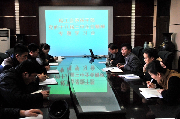 为深入学习党的十八届三中全会精神,推动工会工作全面开展,11月22日,校工会在党政办公楼504会议室召开了工会系统干部党的十八届三中全会精神专题学习会,校党委常委、工会主席李敏义出席并主持了会议,副主席李迎春、吴宝柱以及全体基层工会主席、校工会干部参加了会议。