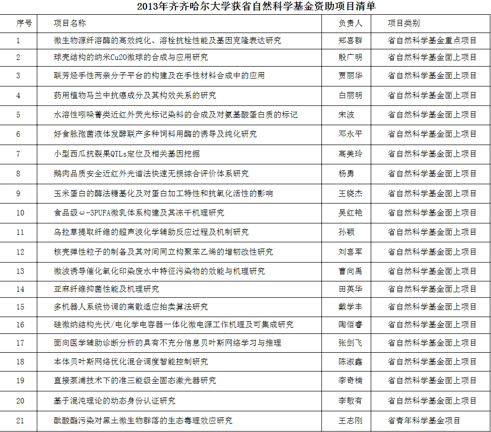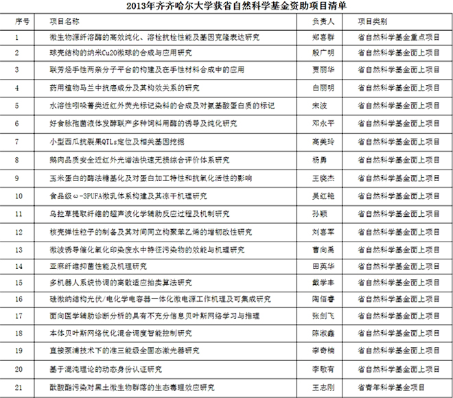 日前,2013年黑龙江省自然科学基金项目评审结果揭晓,我校获省自然科学基金资助项目继续保持了良好的发展态势,共获得资助项目21项,其中面上项目19项,青年科学基金项目1项,重点项目1项;资助经费总额120万元,获批项目数量和资助金额都是我校历年来最多的一年。其中郑喜群教授获得1项省自然科学基金重点项目,是继2011年以来我校获批的第2项省自然科学基金重点项目。