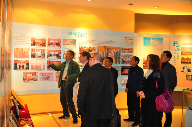 专题讲座结束后,英国北安普顿大学艺术学院院长Paul Middleton(保罗•弥尔顿)、北安普顿大学艺术学院副院长史蒂夫•泰勒、北安普顿大学服装设计教授凯瑟琳•威廉姆斯,国家新媒体基地高级顾问、中国传媒大学电视与新闻学院兼职教授、现代传媒创新与发展研究中心执行主任严军琦博士与中央电视台体育频道著名主持人袁文栋一行在副校长李英杰等陪同下,参观了校史馆。