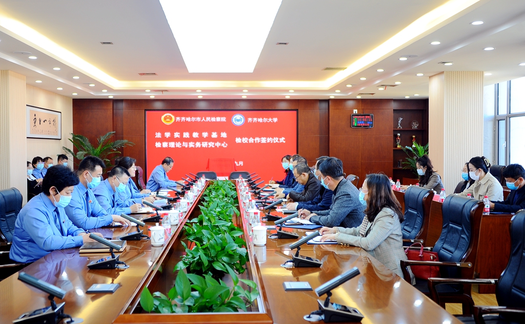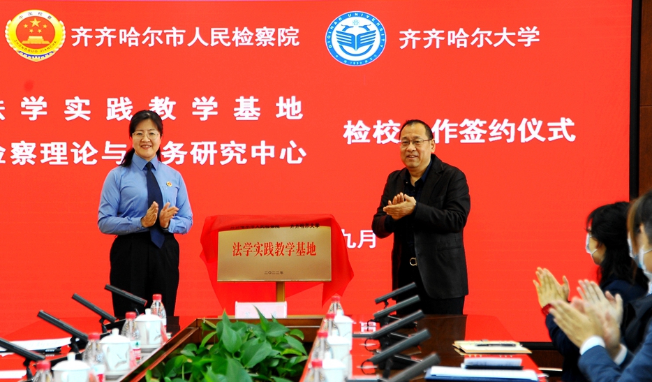 9月28日下午,齐齐哈尔大学与齐齐哈尔市人民检察院校检合作签约暨“齐齐哈尔大学法学实践教学基地”“齐齐哈尔大学检察理论与实务研究中心”揭牌仪式在市检察院举行。齐齐哈尔市人民检察院党组书记、检察长曲立新及市检察院领导班子成员,我校校长董玉庭、副校长李奇楠出席仪式,市检察院中层正职以上干警,我校科研处、教务处、哲学与法学学院负责人以及哲学与法学学院部分教师代表参加仪式。仪式由市检察院党组成员、政治部主任李文新主持。