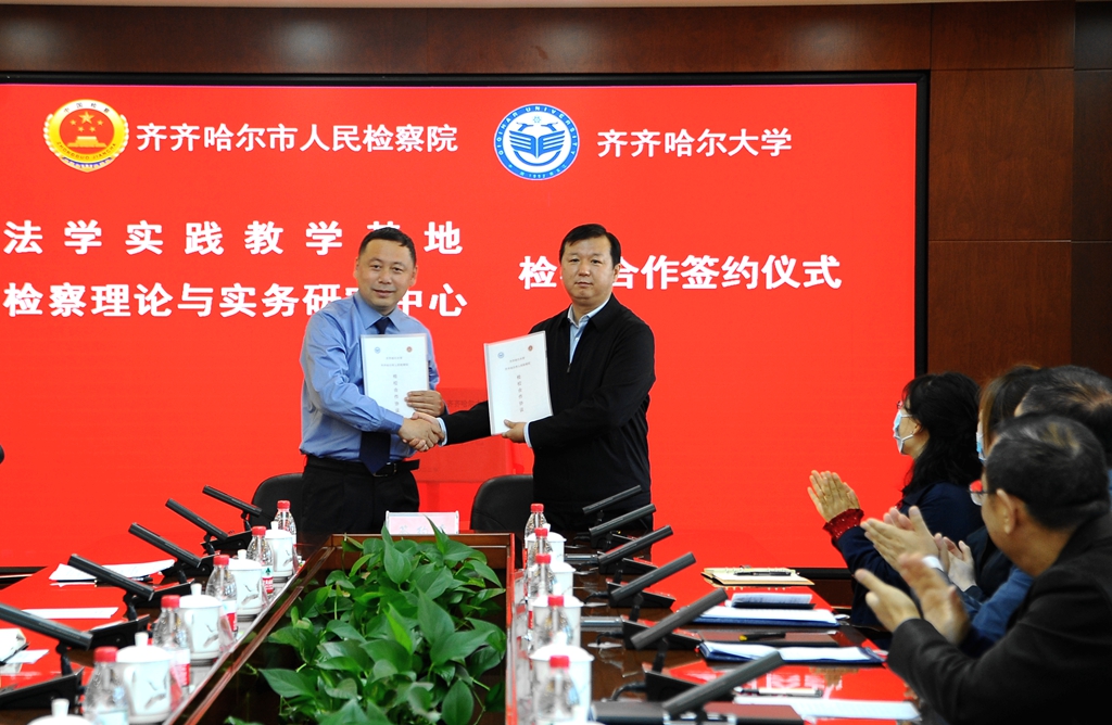 李奇楠代表我校和市检察院党组副书记、常务副检察长乔海东签订了《齐齐哈尔大学 齐齐哈尔市人民检察院校检合作协议》。