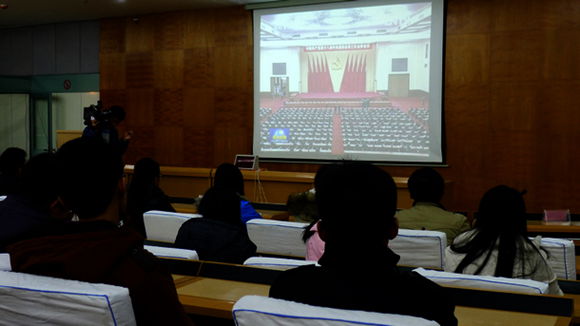 19:00,我校大学生中国特色社会主义理论研究会的学生在学术报告厅集体收听收看中央电视台《新闻联播》播发的《中国共产党第十八届中央委员会第三次全体会议公报》,齐齐哈尔电视台记者进行了采访报道。