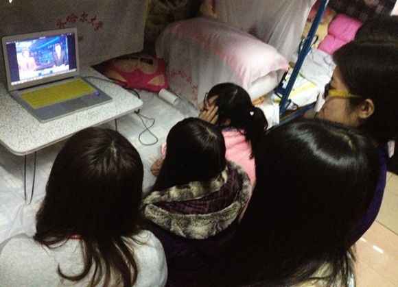 在学生寝室,有的同学通过互联网观看会议盛况,学习十八届三中全会公报。广大干部、党员和教师有的在单位、有的在家里,通过电视或电脑收看、学习十八届三中全会公报。