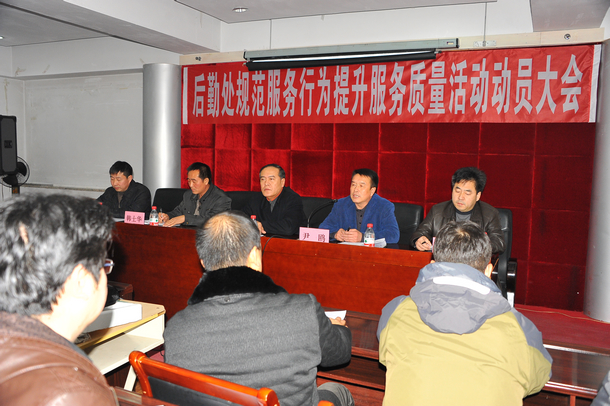 在会上,副处长韩士华宣读了《后勤处规范服务行为 提升服务质量活动实施方案》。副处长杨庆忠宣布了“后勤处规范服务行为提升服务质量活动领导小组成员名单”、“后勤处规范服务行为提升服务质量活动内容及时间安排”。后勤处全体党员、科级以上干部以及班组长参加了会议。会议由后勤处副处长杜立群主持。