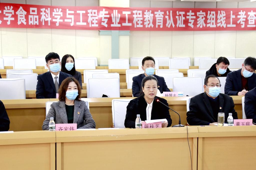 会上,陈桂芝在致辞中代表全体师生员工向各位专家对我校食品科学与工程专业进行线上工程教育认证考查表示热烈欢迎和衷心感谢,并对学校的基本情况、食品科学与工程专业的发展情况、我校自2017年3月启动专业认证工作以来的各项工作举措进行了介绍。她表示,本次工程教育专业认证是我校第三次接受国际工程教育标准下的专家审核,疫情特殊时期,各位专家不辞辛劳,以“云”为媒、以“网”为桥,对我校食品科学与工程专业进行指导和把脉,对于大力推进我校教育教学改革、全面加强各项教学建设、构建符合社会经济发展需要的人才培养框架和知识能力体系、提升专业人才培养质量、提高毕业生就业竞争力,具有重要的意义。真诚希望专家组对我校食品科学与工程专业的建设多提宝贵意见和建议,指导我校进一步完善人才培养体系,提高学生培养质量。学校将以严谨求实的工作态度认真配合专家组的线上考查,全力以赴做好各项配合工作,确保考查顺利进行。