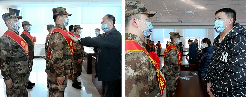 学校及相关学院领导为新兵带上大红花
