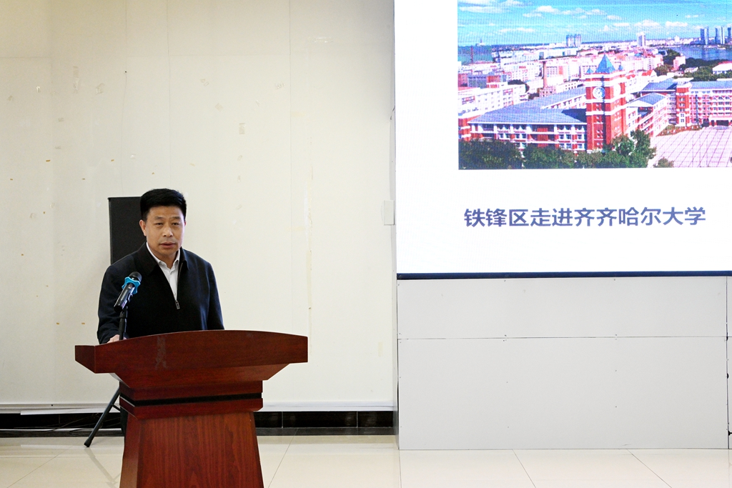 在“铁锋区-齐齐哈尔大学应届毕业生”推介会上,陈宝柱围绕齐齐哈尔市的优势特点、铁锋区的优势特点、铁锋区的人才发展环境等三个方面作了主旨宣讲,欢迎同学们到铁锋区干事创业,期待与大家共同绘就铁锋的美好未来。
