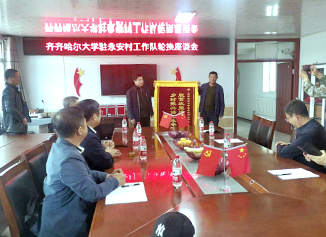 永安村在村部举行了齐齐哈尔大学驻村工作队轮换座谈会。拜泉县委常委、组织部部长王磊,上升乡党委书记赵建军,永安村党支部副书记高玉忠,我校哲学与法学学院院长伊全胜、武装部(保卫处)副部(处)长杜立群、第二批驻村工作队队员李新,第三批驻村工作队队长刘忠双,队员夏金海、吴涛等参加了座谈会。座谈会由我校第二批驻村第一书记、工作队队长秦浩波主持。