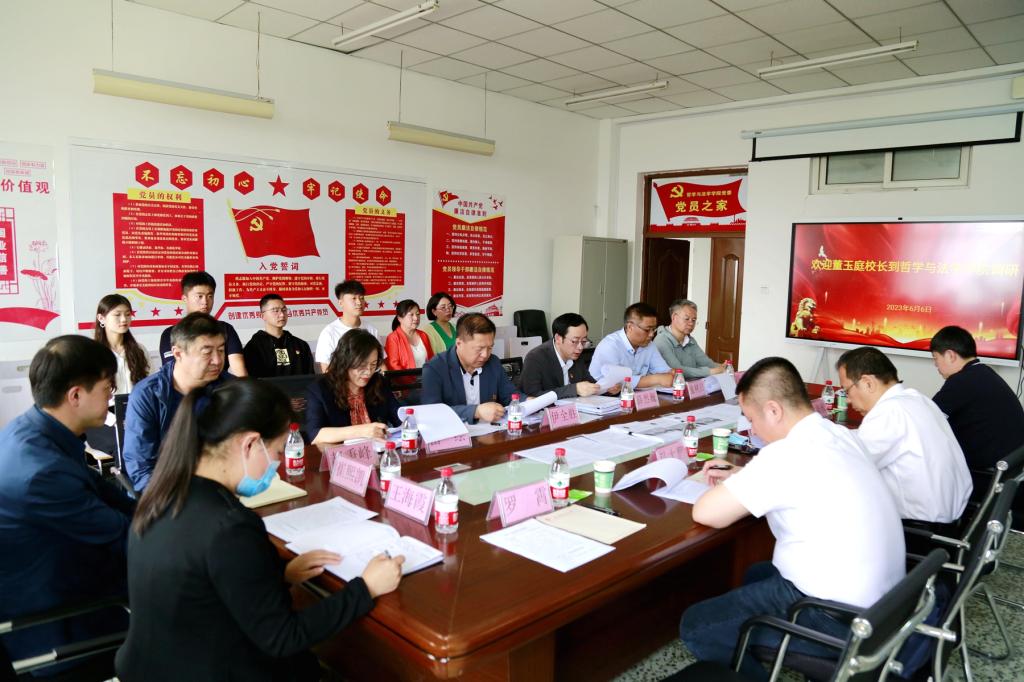 根据党中央和省委关于学习贯彻习近平新时代中国特色社会主义思想主题教育相关部署要求,按照学校领导班子开展“察实情、谋良策、破难题、促振兴”大调研活动安排,6月6日下午,校长、党委副书记董玉庭同志深入哲学与法学学院,开展“推动学校行政管理规范化制度化建设,为办学高质量发展提供法治保障”主题教育专题调研。学校办公室主任孙大鹏、学生工作部(学生处)部(处)长杜海权、校团委书记罗霄参加调研。