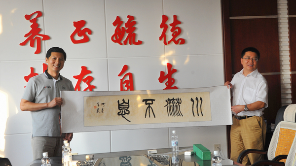 校党委书记李海红代表学校向严军琦博士与袁文栋先生赠送了声誉远播的青年书法家、我校美术与艺术设计学院何鑫教授的书法作品。他表示,感谢严军琦、袁文栋一行到我校传经送宝。我校将进一步加强与国内前沿领域的著名高校、知名专家的沟通与联系,紧跟科技前沿,加强协同创新,不断促进我校高水平大学建设。