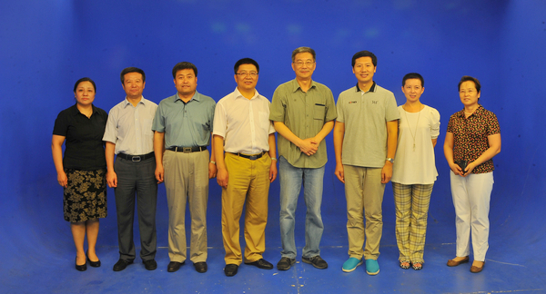 我校有关校领导、职能部门负责人、教育与传媒学院负责人同严军琦教授与袁文栋先生一行在教育与传媒学院虚拟演播室合影留念。