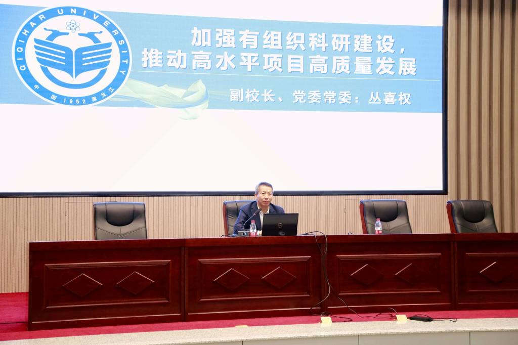 会上,丛喜权以“加强有组织科研建设,推动高水平项目高质量发展”为题,从学校高水平项目的基本情况,存在的差距及不足以及下一步工作部署三个方面对我校高水平项目申报情况进行了介绍。