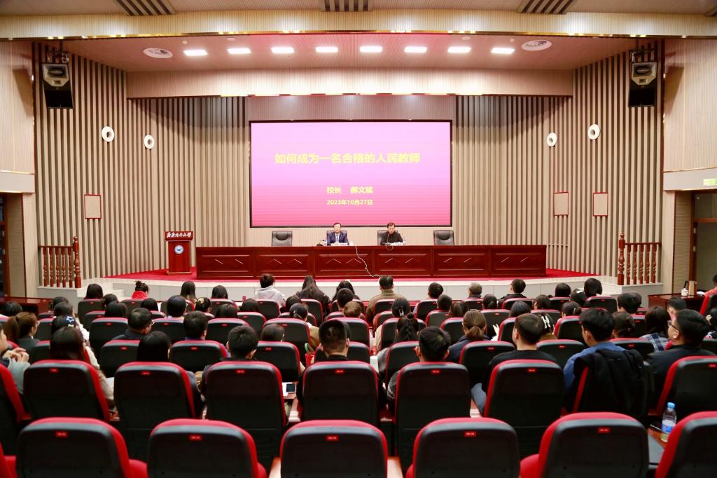 10月27日下午,2023年新进教师入职培训第一讲在学校日新大厦四楼报告厅举行。校长郝文斌以“如何成为一名合格的人民教师”为题为新入职教师做讲座。2023年全体新入职教师参加了培训,培训由副校长李奇楠主持。