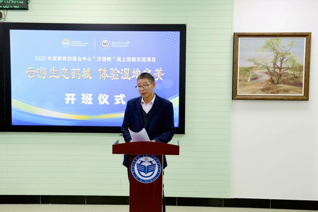 张树军在致辞中向教育部语合中心及黑龙江省教育厅国际合作与交流处再次为我校提供文化交流的机会表示感谢。同时希望通过开展此次项目使更多学员领略鹤城地域文化的深厚底蕴,加强对中国生态文明建设成效的认识,推动文化合作交流,促进国际中文教育发展和中外人文交流互鉴。