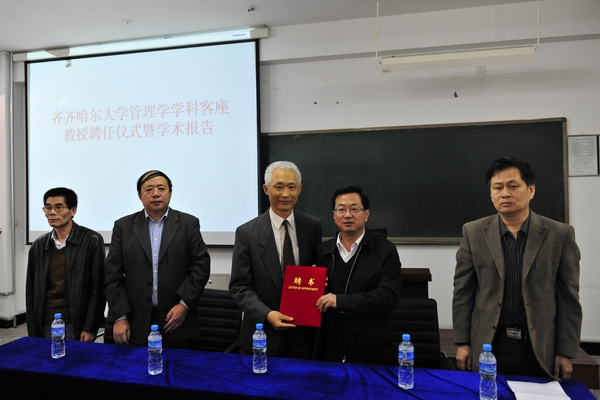 盖元臣副书记对黄铁屿教授的到来表示热烈欢迎,感谢黄铁屿教授来到齐齐哈尔大学作学术讲座和交流,他代表学校向黄铁屿教授颁发了客座教授聘书。并真诚希望黄铁屿教授在传播知识的同时,为中美两国高校间、大陆与台湾高校间建立学术交流平台和友谊之桥贡献力量。